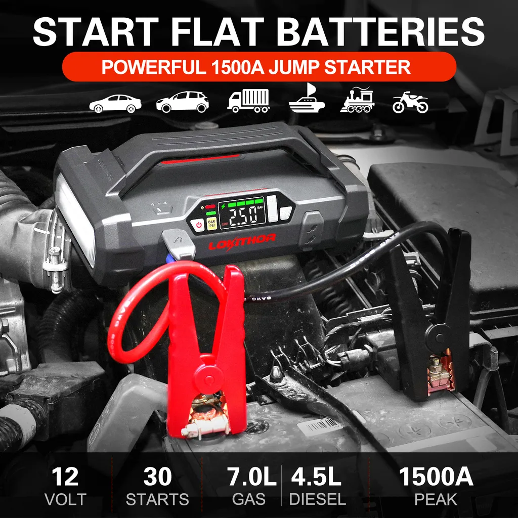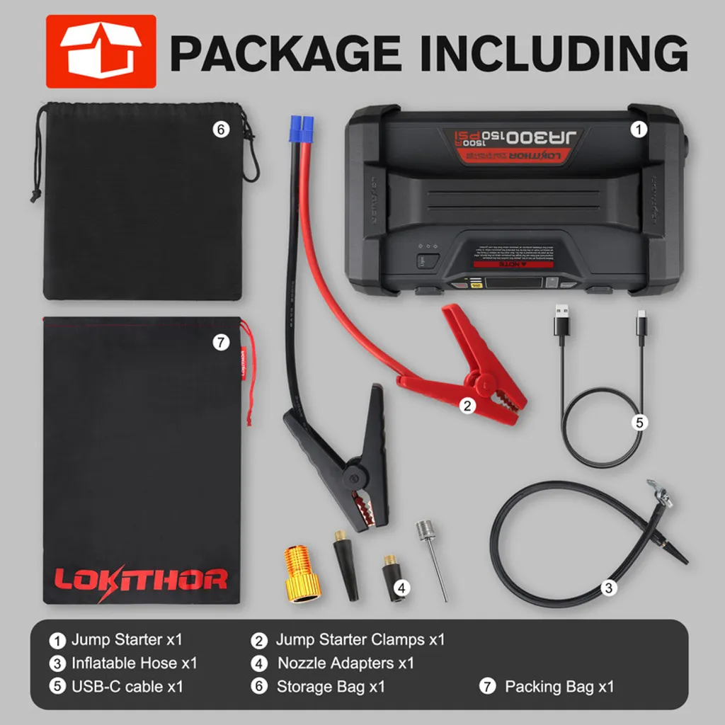 Auto-Starthilfe Mit Luftkompressor 1500A 18000mAh 12V Autobatterie-Booster Für Bis Zu 7L Gas Oder 4,5L Diesel, 150 PSI Reifenfüller Mit Digitalem Bildschirm|Lokithor JA300