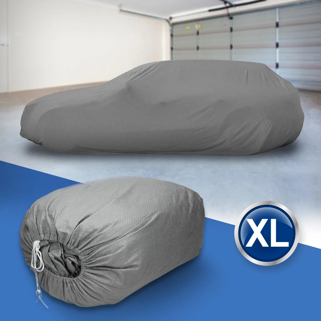 ECD Germany Autoabdeckung 3-Lagig – Größe XL – 465x157x122 Cm – Grau – Atmungsaktiv, Wasserdicht, Staubdicht, UV-Schutz, Winter&Sommer, Abdeckplane Autoplane Vollgarage Autogarage Ganzgarage Schutzhülle