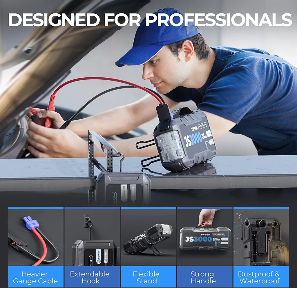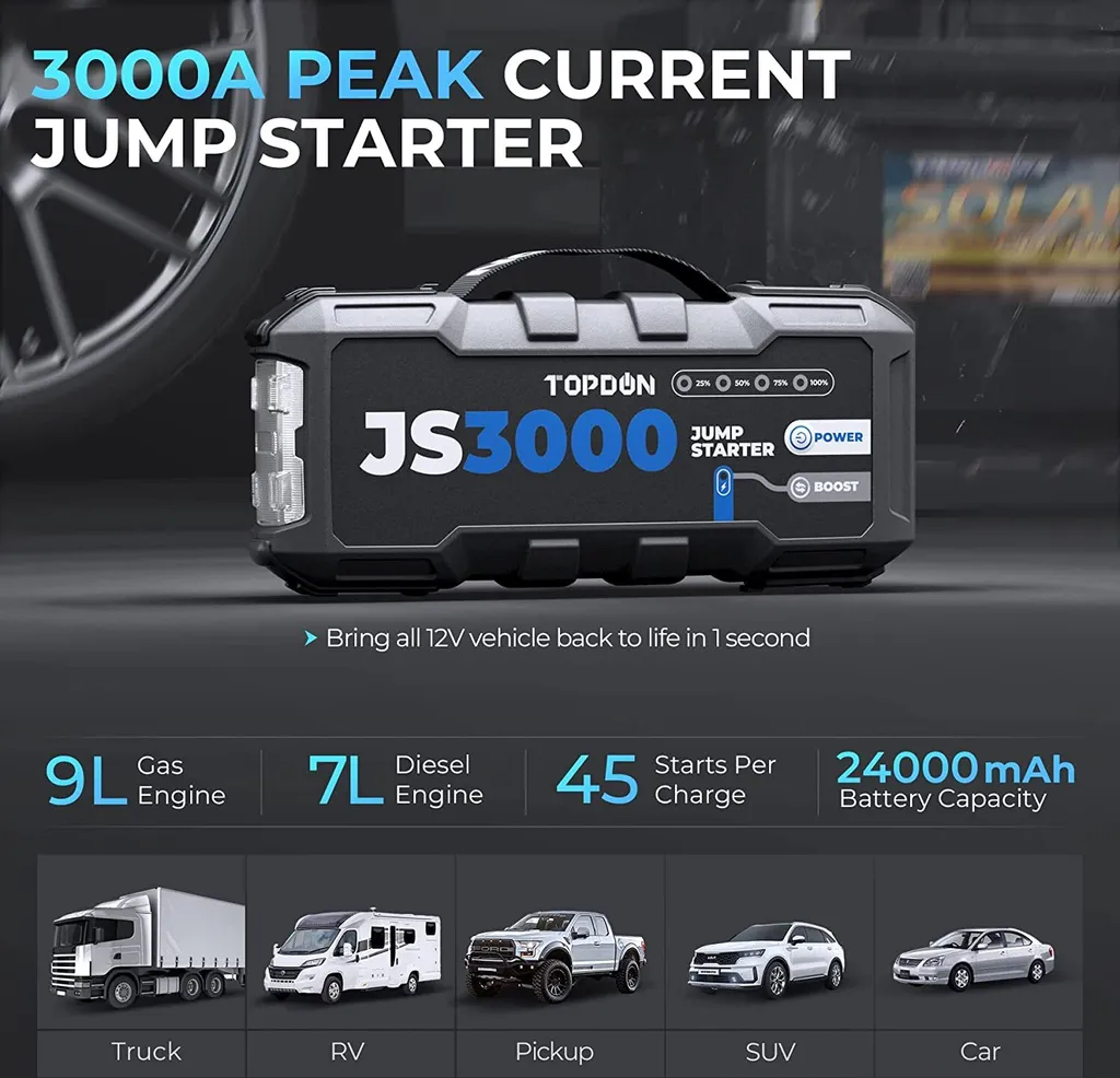 TOPDON 3000A Peak 24000mAh 12V Starthilfekabel, Starthilfe Powerbank Auto Starthilfe Auto KFZ Starthilfe Autobatterie-Starter Jump Starter Auoto Ladegerät Booster Powerbank Autobatteries