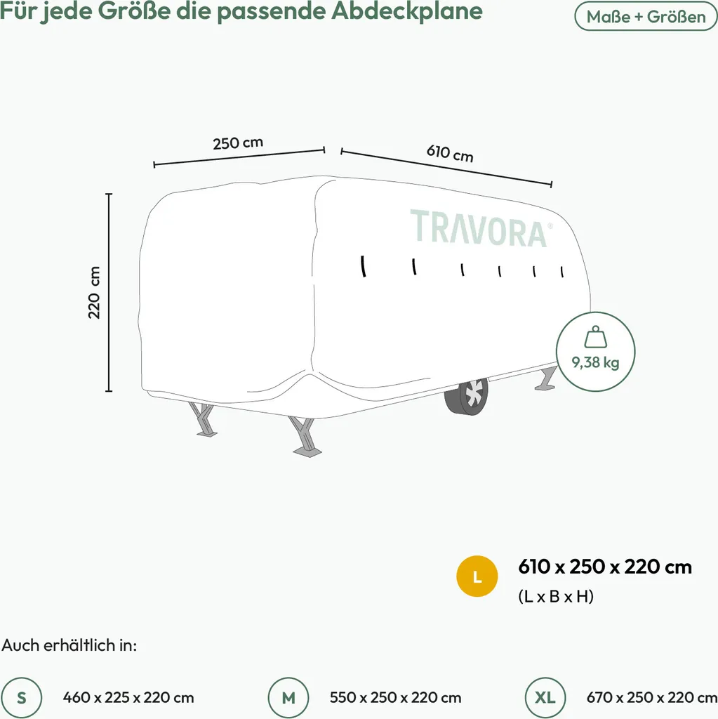 | Zusätzliche Varianten | Wohnwagen Plane – Abdeckplane Caravan Cover Schutzhülle Wohnwagenplane, Größe Plane:L (610 x 250 x 220 cm), Wohnwagen Plane – Abdeckplane Caravan Cover Schutzhülle Wohnwagenplane, Größe Plane:M (550 x 250 x 220 cm) |